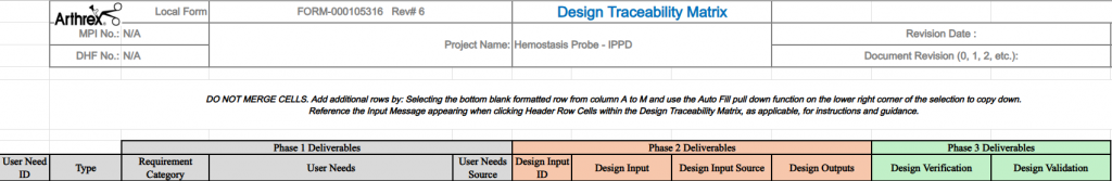 As a part of the Arthrex product design standards, a design traceability matrix is required for any new device in development. Our company liaison sent us a document template and guided us through the proper use of this technical strategy document. As you can see below, the document highlights user needs and categorizes design inputs based on those user needs. For the protection of IP, we have not published items from this document. However, the template can be seen below.