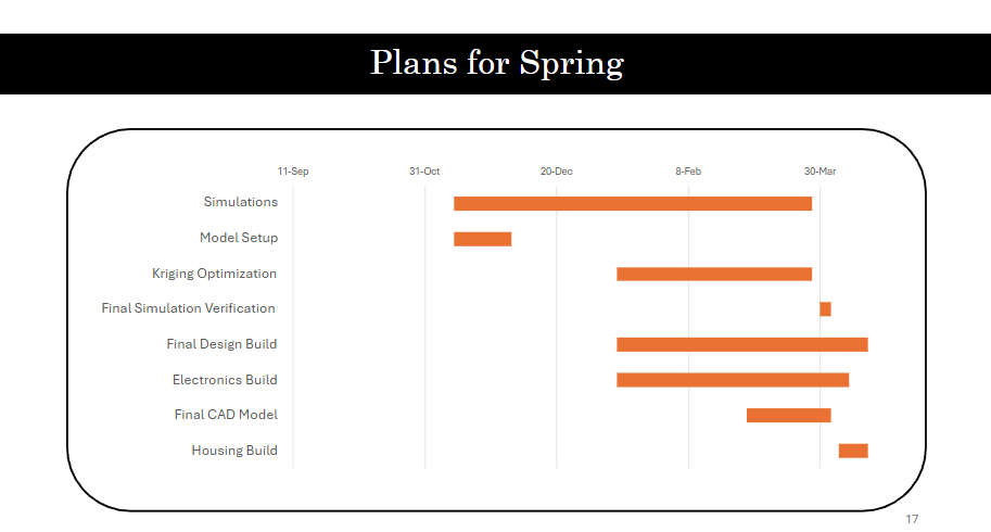 Next semester, our focus shifts toward simulations that are much more relevant to re-entry. We will begin modeling hypersonic flow conditions involving extreme Mach numbers, shock structures, and high thermal loads. Our simple test geometry will evolve into analyses of our actual design concepts, giving us insight into how they behave during re-entry and how we can improve their demisability. The Kriging model will continue to guide which configurations we test, allowing us to combine optimization and CFD to converge on a final design.